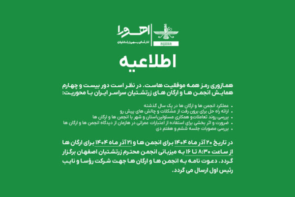 بیستوچهارمین همایش انجمنها و ارگانهای زرتشتیان سراسر ایران بررسی عملکرد، چالشها و راهکارهای توسعه در جامعه زرتشتی – ۲۰ و ۲۱ آذر ۱۴۰۴ در اصفهان به یاری اهورامزدا 🌿 همازوری، رمز همه موفقیتهاست. دور بیستوچهارم همایش انجمنها و ارگانهای زرتشتیان سراسر ایران با هدف همافزایی و بررسی راهکارهای توسعه اجتماعی و فرهنگی برگزار میشود. این […]